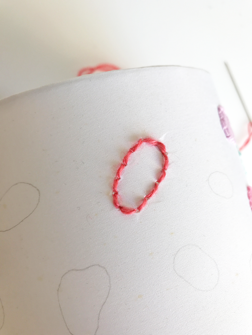 Now you can “fill” the shapes using long embroidery stitches, or you could use shorter stitches if you prefer. Don’t worry too much about filling the shape exactly, as leaving a few small gaps around the edges of the shape can add an interesting effect