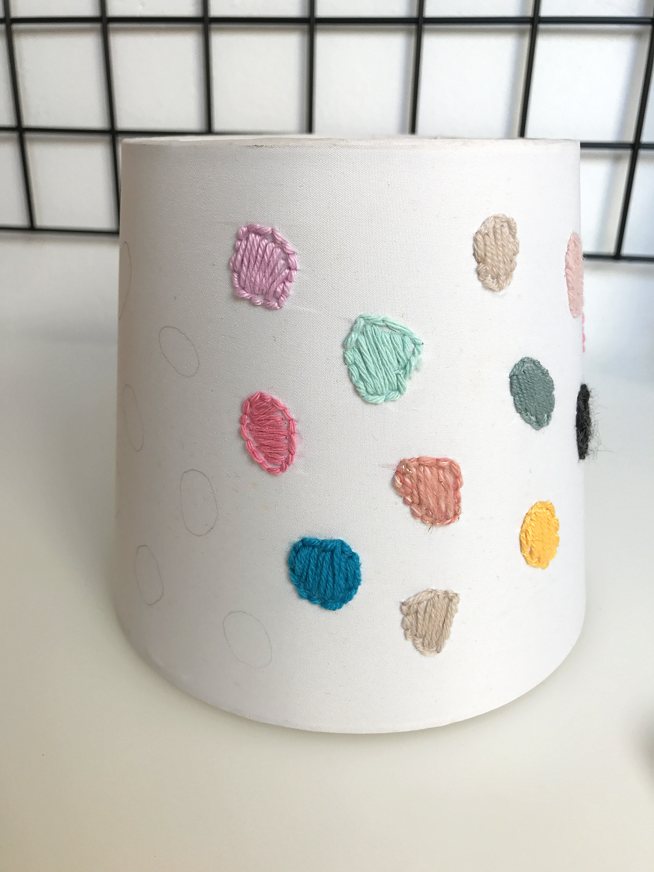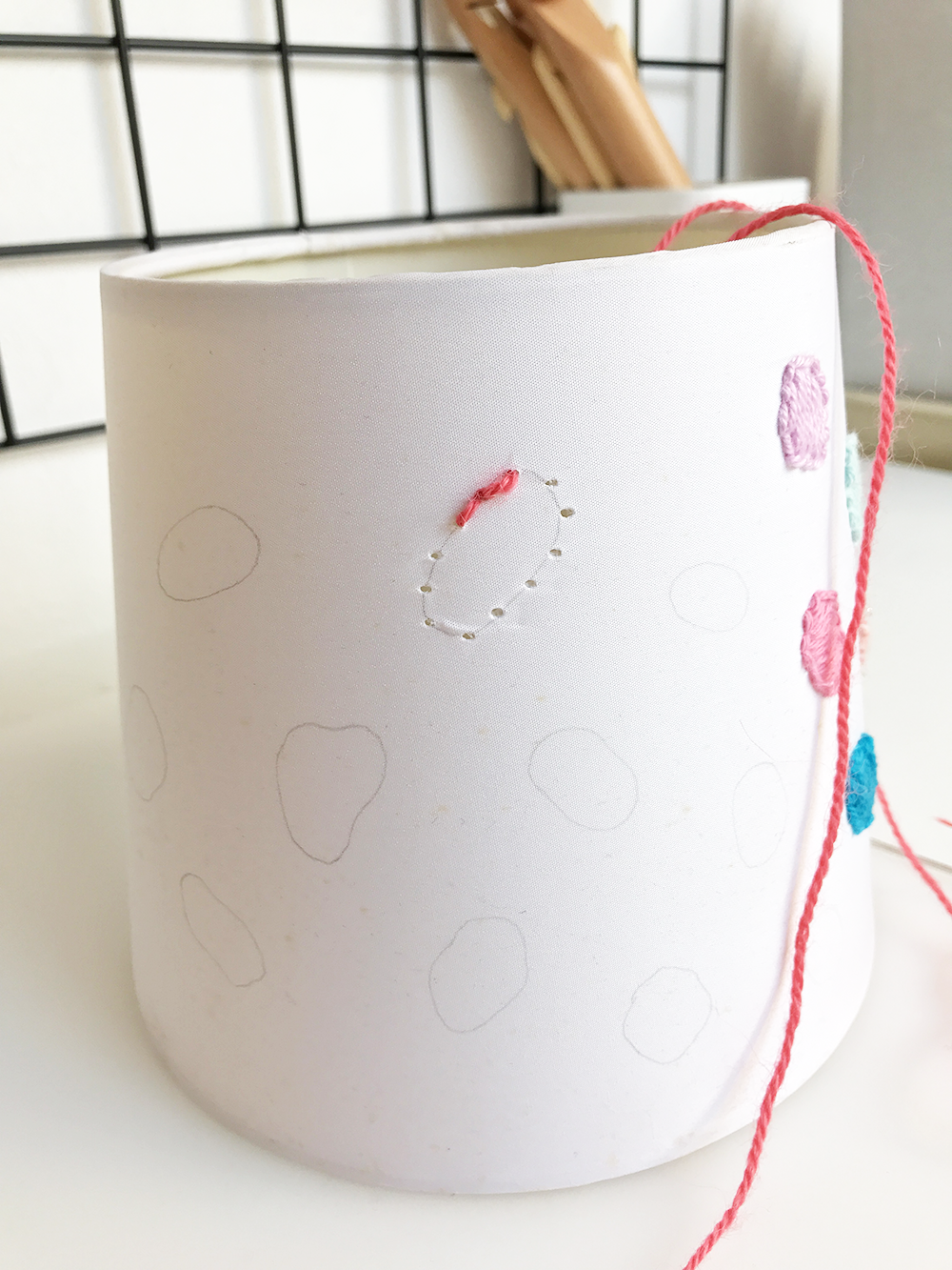 Using a pencil, draw some rough ‘splodge’ shapes or ovals all over the lampshade. Try not to make them too neat, as the idea is to give an irregular look. Afterwards, pierce holes using the thinner needle around the outlines.