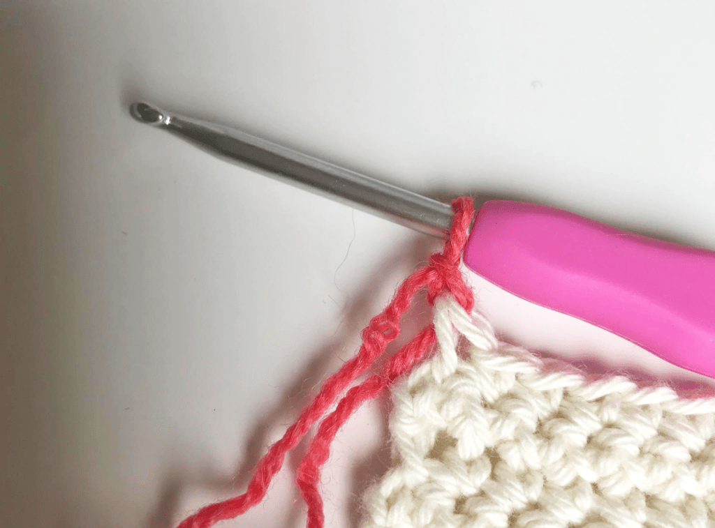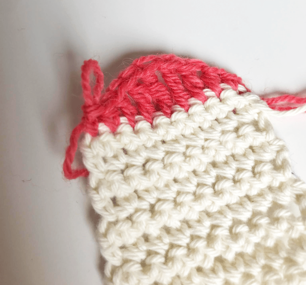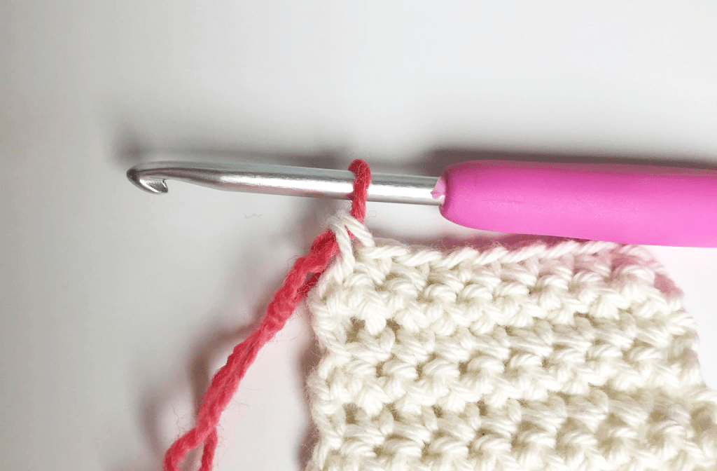 3. When you reach the final single crochet stitch on the last row (when you have two loops on your hook), pull through the new colour that you are using for the roof. You have now changed colour. Chain one and turn.
