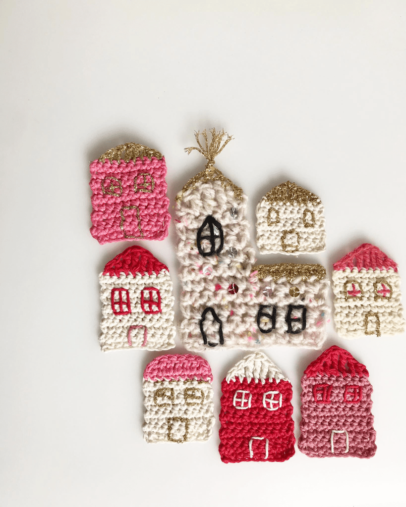 Yarn: Sport weight cotton yarn (I used Rito Hobby’s Infinity Hearts Lotus 8/4) in your chosen colours for roof and house body, plus combinations of Rico Creative Lamé and Drops Alpaca in Coral, plus scraps of DK/Sport weight yarn for embellishments and embroidery.