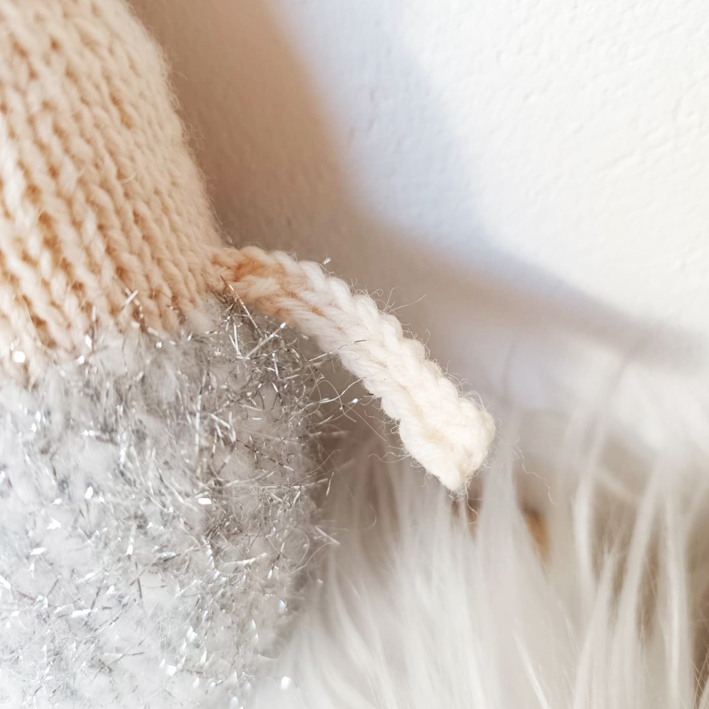 Yarn: Less than 15g of DK yarn or fingering weight yarn held double (I used Hobbii Friends Sock Wool in 03 held double) which counts as yarn one, and approximately 25g of tinsel yarn (I used Miss Sparkle by Hobbii*) which counts as yarn two. For the tiny tassel you’ll need oddments of DK weight cotton yarn. I used scraps of Ricorumi DK in 011).