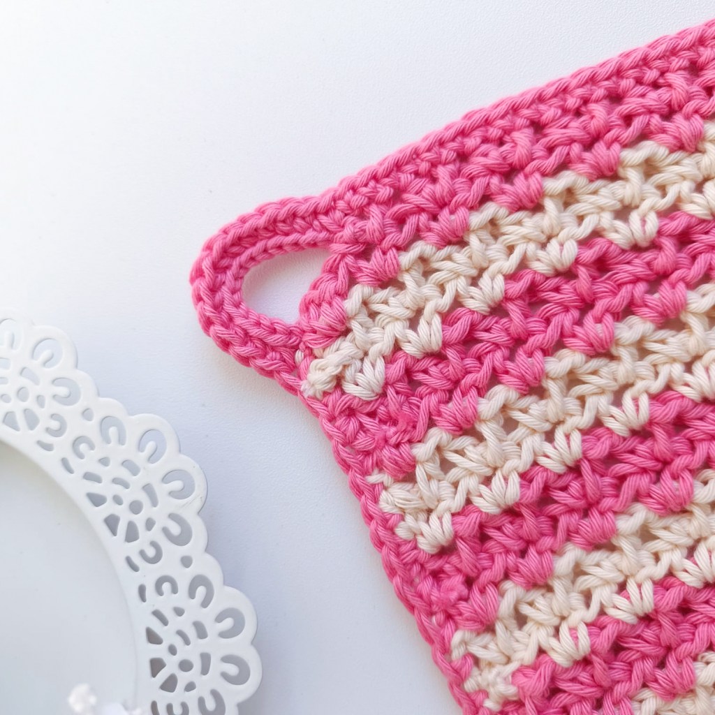 For this pattern, I used one skein each of Hobbii Friends Cotton 8/8 in Oatmilk (COLOUR ONE) and Candyfloss (COLOUR TWO). When making towels or washcloths, always choose plant-based yarns like cotton, bamboo, or linen, as acrylics and wools aren’t suitable for projects that get wet or need frequent washing.